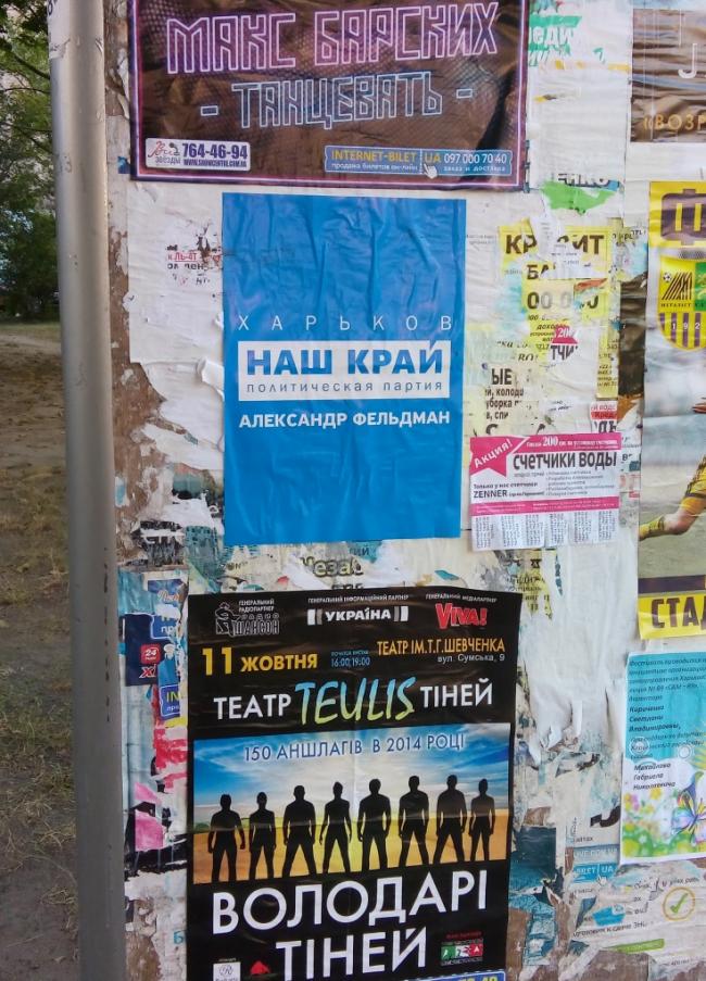 Когда в 2011 году Высший административный суд Украины не оставил права коммунальным предприятиям регулировать наружную рекламу, он, как оказалось, спас хоть какую-то видимость демократичности предвыборной кампании в Харькове. Если посмотреть на центральные улицы города, то там можно увидеть все политические силы, желающие побороться за голоса избирателей. Кое-где, стоя на месте, можно увидеть политическую рекламу сразу пяти сил.