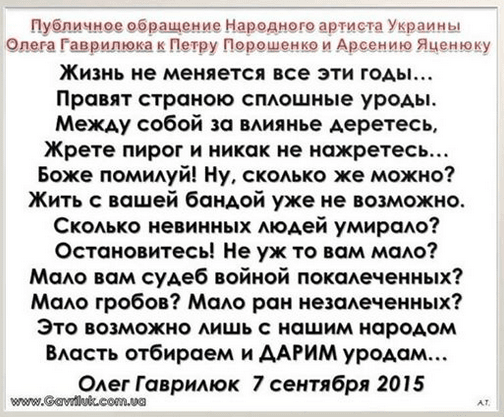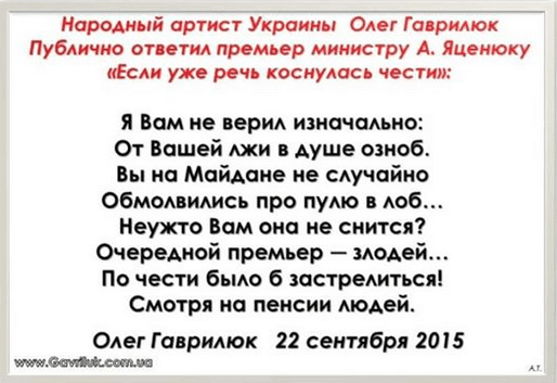 Поэт, композитор, исполнитель, народный артист Украины Олег Гаврилюк получил звонок от юриста из Кабинета министров с требованием извиниться за стихотворное обращение кпремьер-министру Украины Арсению Яценюку и Президенту Украины Петру Порошенко.