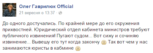 " До одного достучались. По крайней мере до его окружения прихвостней. Юридический отдел кабинета министров требуют публичного извинения! Пугают судом... Вот сижу и сочиняю извинение... Вывешу его тут, когда закончу. Так вот чем у нас занимаются юристы в Кабмине", - прокомментировал артист попадание в одну "цель" при помощи слова.