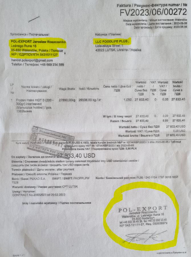 За 2023 рік «Фудлайф Плюс» вже ввезла в Україну від фіктивного польського постачальника-посередника Pol-Export близько 500 000 кг. мороженого хеку заявивши його вартість по 1.00 $/кг.