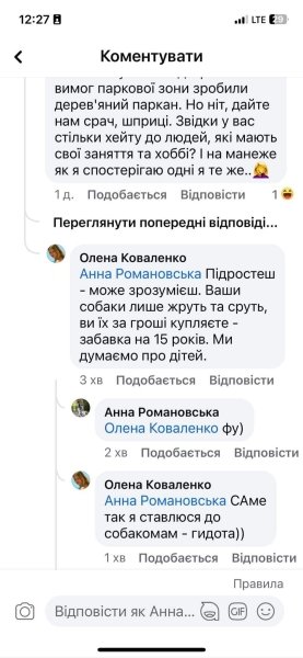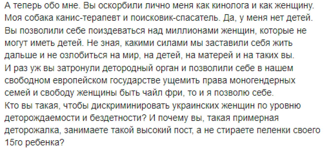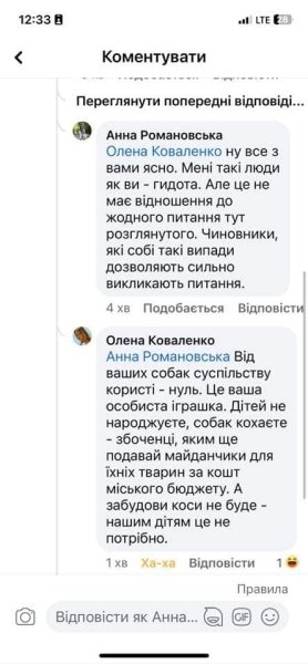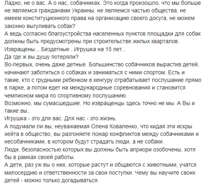 "Збоченці ... Бездітні ... Іграшка на 15 років ... Та де ж ви душу втратили? По-перше, дуже "дітні". Більшість собачників, виростивши дітей, починають піклуватися про собак і займатися з ними спортом. Є і такі, хто з немовлям у "кенгуру" відпрацьовує послух прямо в парку, а потім їде на міжнародні змагання і стає чемпіоном світу зі спортивного послуху. Можливо, ми божевільні. Але збоченці тут точно не ми. А ви і такі, як ви. Іграшка — це для вас. А для нас - життя", — пише Катерина Головачова, одна з користувачів мережі з Дніпра, яка звернула увагу на скандальні висловлювання.