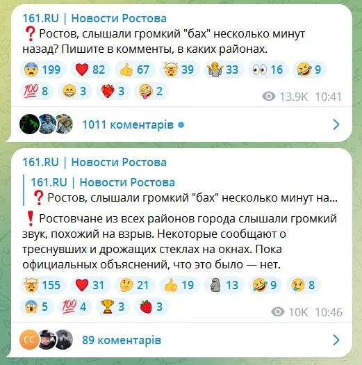 "Ростовчани з усіх районів міста чули гучний звук, схожий на вибух. Деякі повідомляють про тріщини й дрижання скла на вікнах. Поки що офіційних пояснень, що це було, немає", – пишуть у місцевому паблику "161.RU".