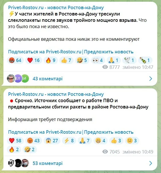 Водночас місцеві ЗМІ, посилаючись на джерело, пишуть про "роботу ППО та попереднє збиття ракети в районі Ростова-на-Дону", зазначаючи, що "інформація вимагає підтвердження".