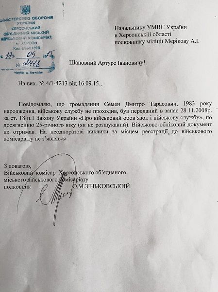 Второй опубликованный Кивой документ гласит о том, что глава херсонского «ПС» игнорировал вызовы в военкомат.