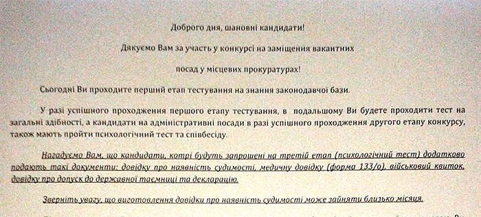 Первый этап тестирования, который начался 5 сентября 2015 года, закончился. На нём проходили тестирование работники именно прокуратуры, а позже и юристы, желающие пройти отбор на должности руководителей местных прокуратур.