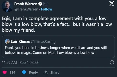 Про це Клімас написав у соціальній мережі X, раніше відомої як Twitter, реагуючи на повідомлення промоутера Дюбуа Френка Уоррена про те, що він подав апеляцію до Всесвітньої боксерської асоціації. Зокрема, у британця не згодні з рішенням рефері Луїсча Пабона визнати нелегітимним удар Даніеля нижче поясу українця.