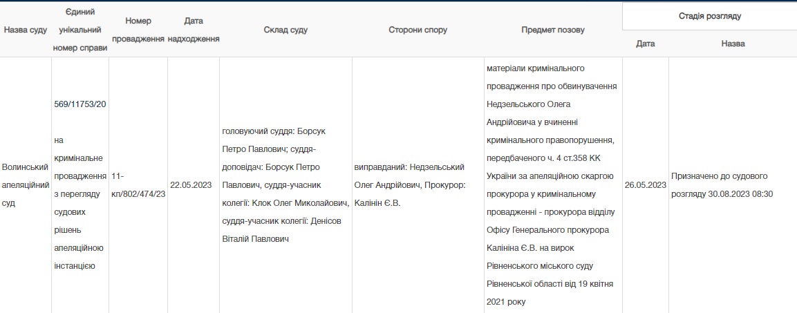 Волинський апеляційний суд звільнив від кримінальної відповідальності та закрив провадження за обвинуваченням у використанні підробних документів (ч.4 ст.358 КК України) 30-річного уродженця Львівщини Олега Недзельського - сина так званого "злодія в законі" Андрія Недзельського на прізвисько "Нєдєля"/"Андрій Львівський". Відповідне рішення 30 серпня 2023 року постановила колегія служителів Феміди у складі головуючого судді Петра Борсука та суддів-учасників - Олега Клока і Віталія Денисова.
