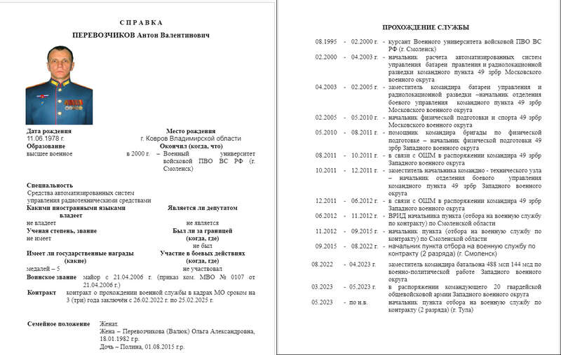 Для початку познайомимо вас з російським офіцером, завдяки якому це дослідження взагалі стало можливим. Перевозчиков Антон Валентинович, 11.06.1976 р.н., військове звання – майор. З травня 2023 року – начальник пункту відбору на військову службу за контрактом в місті Тула.