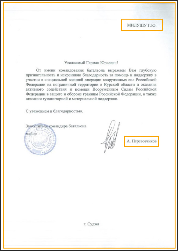 Вірогідно, що перебуваючи на черговому відновленні, полк потребував не тільки значних людських, а й матеріальних ресурсів. Тож Перевозчиков швидко перехопив ініціативу, щоб не залишатись на передовій, а повернутись на тилову посаду. Ось він дякує за “благодійну допомогу” Герману Мілушу – засудженому у Латвії бізнесмену, що ще в 2007 році втік в тайнику російської вантажівки. Засудили Мілуша за те, що він намагався шляхом підкупу встановити в Юрмалі – улюбленому місті російської агентури на березі Балтійського моря – підконтрольного мера. Звісно, корупціонер Мілуш почуває себе в Росії мов риба у воді, тому був швидко виправданий і його справи пішли вгору.