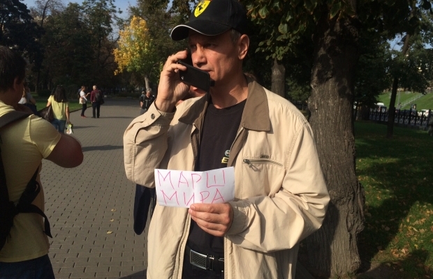 Як передає власний кореспондент УНІАН, після початку руху невеликої колони учасників заходу поліція почала вибіркове затримання, в першу чергу людей, які тримали маленькі листочки з написом «Марш миру».