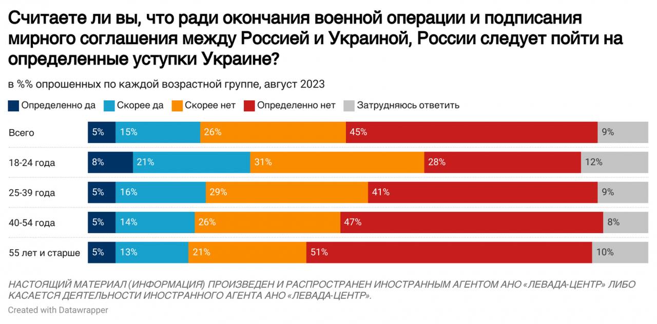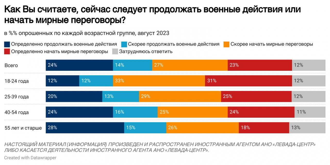 "Як ми вже неодноразово писали, під час війни достовірність будь-яких соцопитувань - поняття умовне, тому що люди часто бояться висловлювати свою справжню думку. Тому, як правило, у воюючій країні соцопитування показують кількість прихильників "війни до переможного кінця" більше, ніж у реальності. А прихильників замирення, відповідно, менше. І з урахуванням цього застереження дані російського соцопитування тим більше промовисті в тому плані, що кількість прихильників мирних переговорів серед росіян більша, ніж прихильників продовження війни, при цьому більшість проти того, щоб повертати Україні вже захоплені території, але не проти негайного припинення вогню (для 72% це переважна або допустима умова мирної угоди). Іншими словами, більшість росіян підтримують так званий "корейський сценарій" - припинення бойових дій по лінії фронту. І лише меншість за "війну до переможного" кінця", - пише канал.