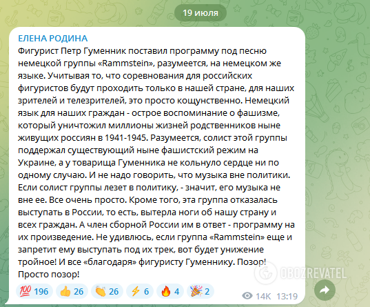 Зазначимо, що з вимогою заборонити Rammstein у Гуменника ще влітку виступила одіозна російська спортивна блогерка Олена Родіна. Після відмови Петра від композиції, 38-річна москвичка всіх привітала зі святом.