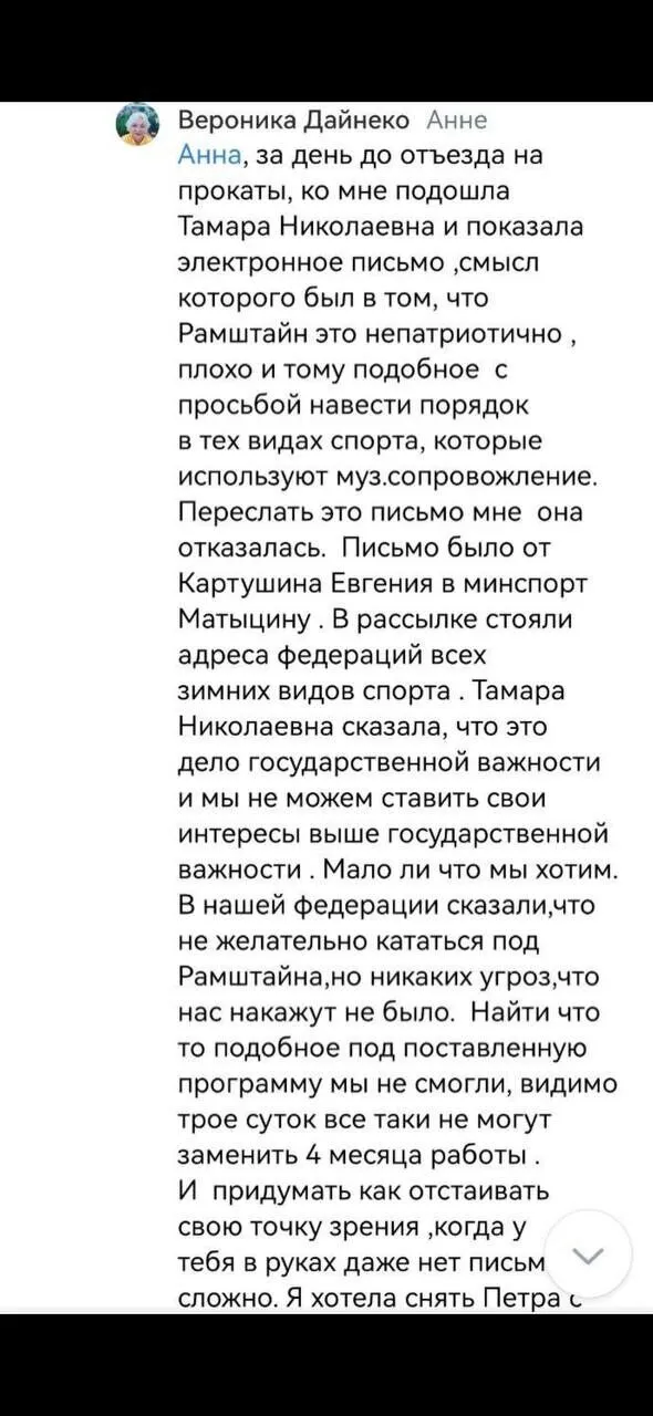 "Сенс листа був у тому, що Rammstein – це непатріотично, погано, тощо, з проханням навести лад у тих видах спорту, які використовують музичний супровід. Переслати цей лист мені вона відмовилася", – розповіла Дайнеко на своїй сторінці в одній із російських. соцмереж.