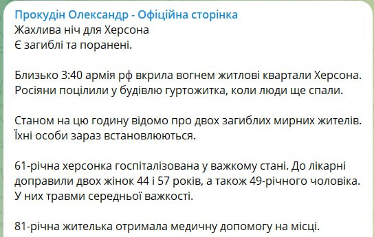 Близько 3:40 армія РФ вкрила вогнем житлові квартали Херсона. Росіяни поцілили у будівлю гуртожитка, коли люди ще спали, повідомив голова ОВА Олександр Прокудін.