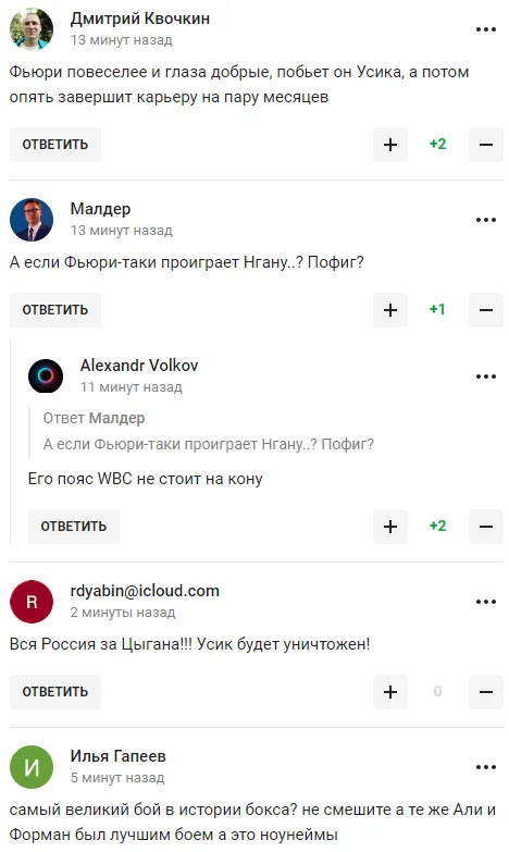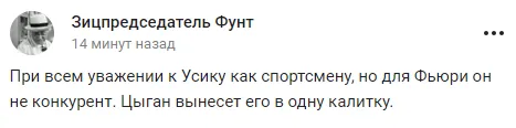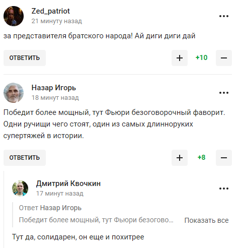 "Ну невже... З дитинства за Цигана!", "За представника братнього народу! Ай-дігі-дігі-дай", "Переможе більш потужний, тут Ф’юрі беззаперечний фаворит", "При всій повазі до Усика як спортсмена, але для Ф’юрі він не конкурент. Циган винесе його в одну хвіртку", "Ф’юрі веселіший і очі добрі, поб’є він Усика", "Вся Росія за Цигана! Усика буде знищено!", "Сподіваюся, Ф’юрі серйозно до бою підійде, Усик взагалі йому не конкурент при належній підготовці", "Шкода, Повєткін закінчив", "От і перша поразка Усика", - пишуть російські вболівальники.