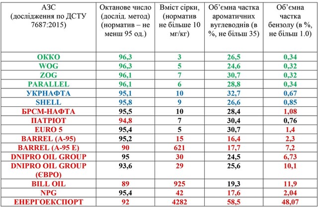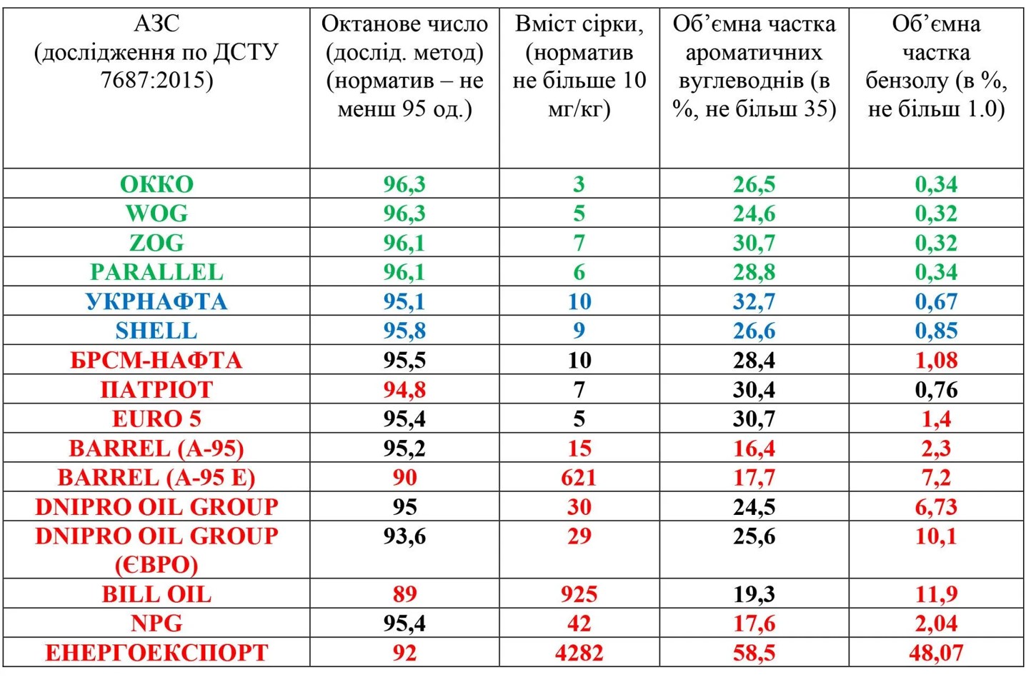 Експерти традиційно розділили результати, отримані в лабораторії на зони – зелену, синю та червону. У першу потрапили мережі, результати яких відповідали нормативам Євро-5, синю – зразки без порушень, що не мають граничні показники, та червона – мережі, бензин на яких не відповідав нормативам профільного ДСТУ. Зразки були перевірені за основними параметрами – октанове число, вміст сірки та об’ємні частини ароматичних вуглеводнів та бензолу. Додатково експерти перевірили вміст біоетанолу (спирту), ізопропілового спирту, метанолу та ефірів.