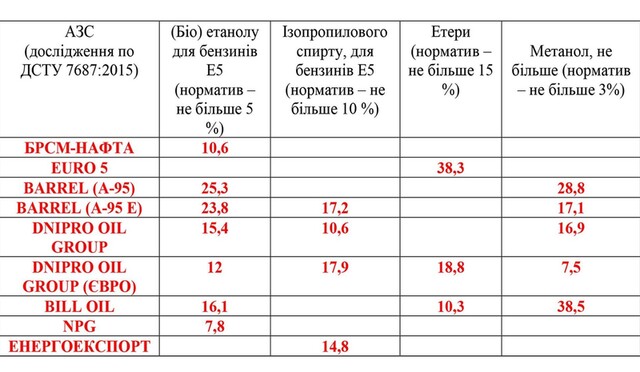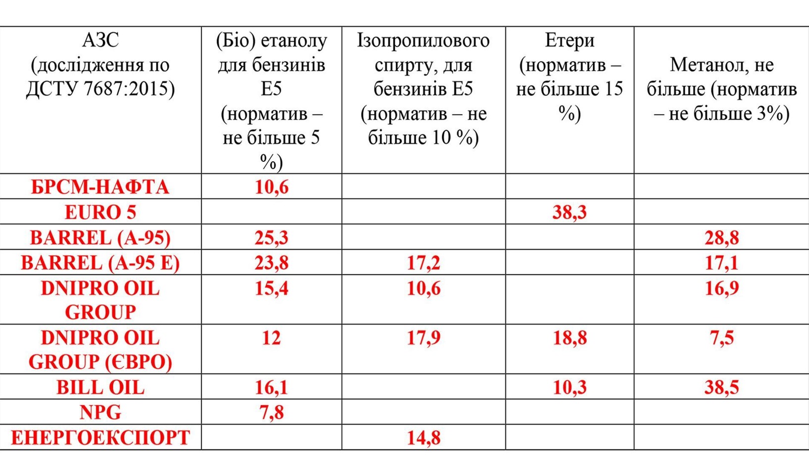Додатково експерти перевірили зразки на вміст кисневмісних сполук, включаючи вміст біоетанолу (спирту), ізопропілового спирту, метанолу та простих ефірів. Тут також результати були разючими. Наприклад, "бензин", що продається на АЗС Дніпро-нафта, майже на 60% складається зі всіх вищезгаданих компонентів. І ця суміш ще й відзначена як бензин підвищеної якості "євро". "Бензин" від мережі BILLOIL на 38% складається з отруйного метанолу. При попаданні метанолу в організм людини він перетворюється на формальдегід. Ця токсична речовина викликає серйозні порушення обміну речовин, сліпоту, постійну неврологічну дисфункцію. Загалом, практично в кожному зразку було виявлено порушення з компонентами, що однозначно свідчить про те, що це паливо було виготовлено не в заводських умовах.