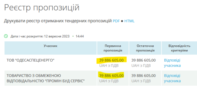 Це призвело до того, що вищевказані переможці торгів падали на визначені відсотки. А у конкурентів було лише два шляхи. Там, де єдиним конкурентом «Одесаспеценерго» було ТОВ «Промін Буд Сервіс», вони робили однакові до копієчки пропозиції. І «Одесаспеценерго» виграло, бо завантажило свою пропозицію у «Прозорро» на годину раніше від «Проміна».
