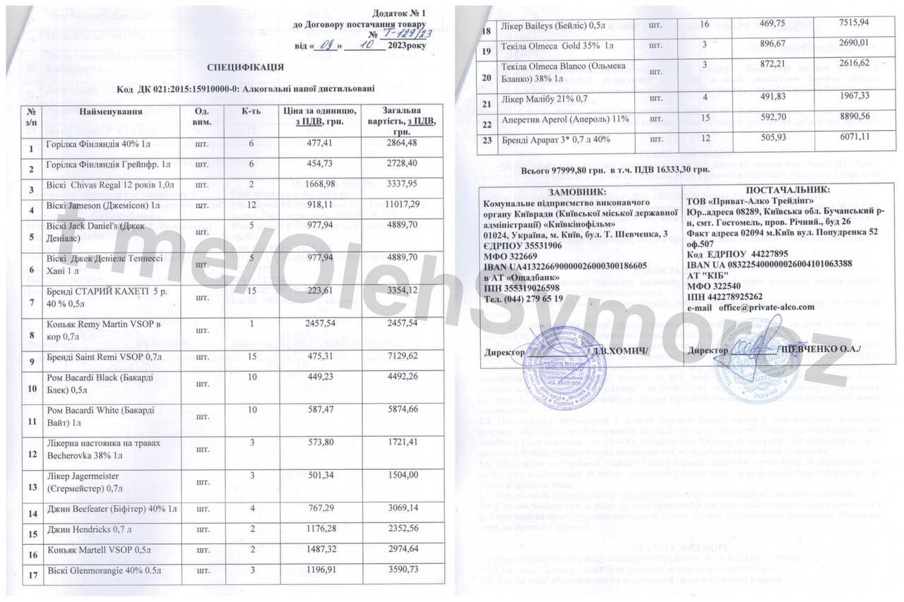 Комунальне підприємство уклало договір на 97 999 бюджетних гривень за 157 пляшок алкоголю, серед якого віскі Chivas regal 12 річної витримки, Jack daniel’s tennessee, ром, лікер Jagermeister та багато іншого. Строк поставки товарів: 09 жовтня 2023 - 31 грудня 2023. У торгах переміг єдиний учасник - ТОВ "Приват-Алко Трейдінг".