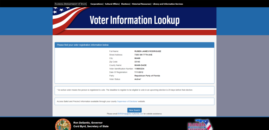 Наприкінці 2022 року я звернувся в Державний департамент штату Флорида для отримання виписок із реєстрів та апостилю для цих документів. Документи були підготовлені та надіслані в Україну влітку цього року. Окремо з реєстру виборців штату Флорида було отримано витяг щодо реєстрації за адресою особняка Анастасії Родрігес її чоловіка Рубена Джеймса Родрігеса як виборця Республіканської партії. Раніше у мене не було цих даних, а тому вони стали остаточними та безапеляційними для доведення того, що донька мера Тернополя офіційно володіє маєтком за майже два мільйони доларів.