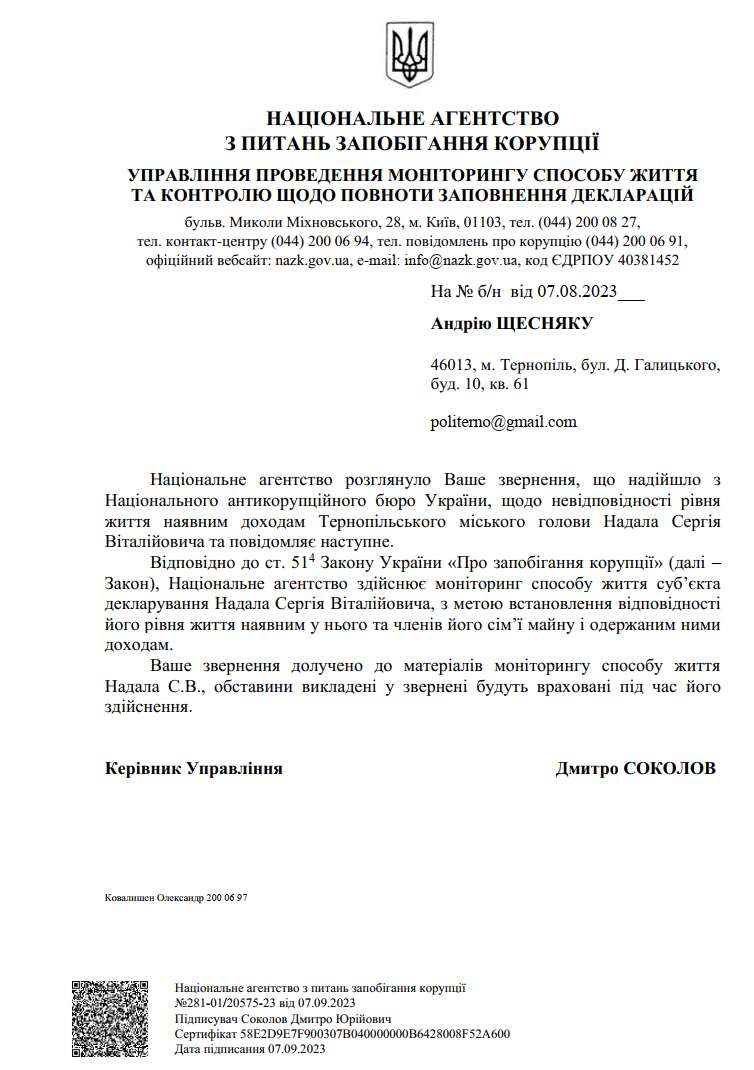 На оприлюднення нових даних мер Тернополя вирішив не реагувати. Але цього разу продовження минулорічного розслідування помітило Національне агентство з питань запобігання корупції, яке розпочало перевірку щодо «встановлення відповідності рівня життя наявним у Сергія Надала та членів його сім’ї майну і одержаним доходам».
