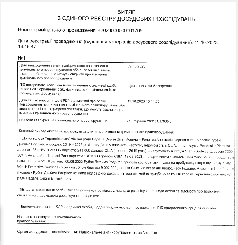 У вересні 2022 року інформаційний простір Тернополя сколихнула новина про те, що 26-річна донька міського голови цього 220-тисячного західноукраїнського міста Сергія Надала обзавелася у Маямі маєтком за 1 870 000 доларів.