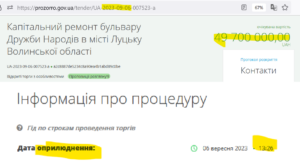 Крок 9. А менш ніж за годину замовник оголосив новий тендер на ремонт того ж бульвару Дружби народів, очікуваною вартістю 49 700 000 грн. Це всього на 20 тисяч гривень або 0,04% менше від очікуваної вартості першого тендеру.