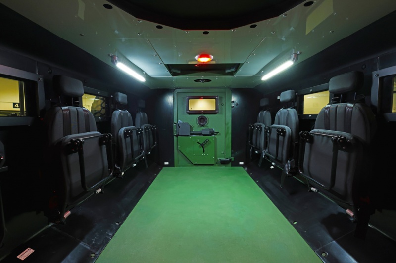 Бронеавтомобіль розрахований на розміщення до 10 пасажирів і має високий рівень захисту від вибухових пристроїв та засідок, забезпечуючи безпеку екіпажу.
