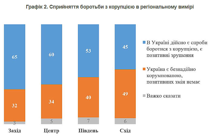 Повідомляється, що із Заходу на Схід стає менше тих, хто вважає, що в Україні дійсно є спроби боротися з корупцією. Хоча при цьому в інших регіонах, крім Сходу, більше тих, хто позитивно оцінює ситуацію, ніж тих, хто оцінює негативно.