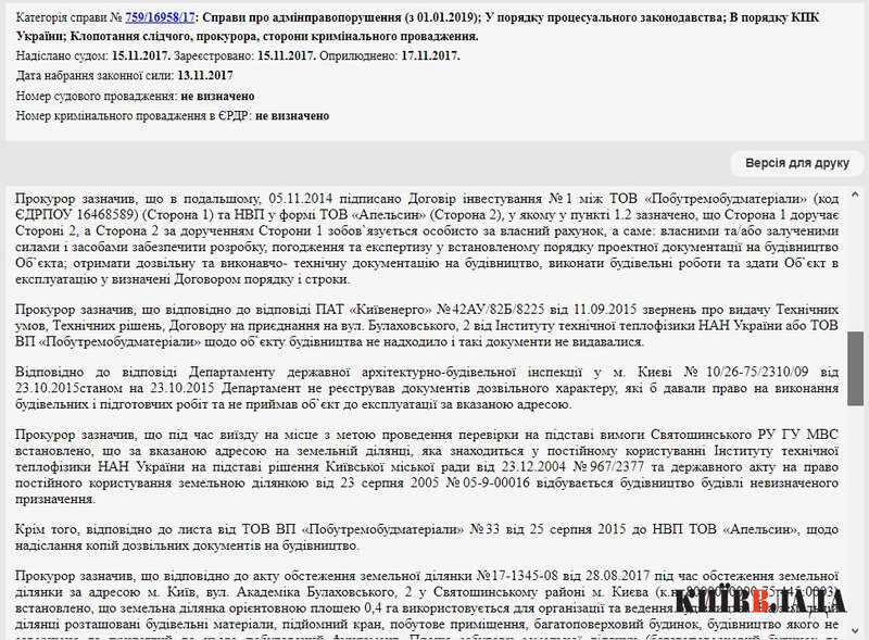 Так, в рамках даної справи правоохоронці ще в 2015 році встановили, що на земельній ділянці на вул. Академіка Булаховського, 2 здійснюється будівництво будівель невстановленого призначення попри відсутність дозволів на проведення таких робіт. Зокрема, Департамент Державної архітектурно-будівельної інспекції (ДАБІ) у Києві повідомив слідчим що станом на той період не реєстрував документи, які б давали право на виконання будівельних і підготовчих робіт за вказаною адресою.