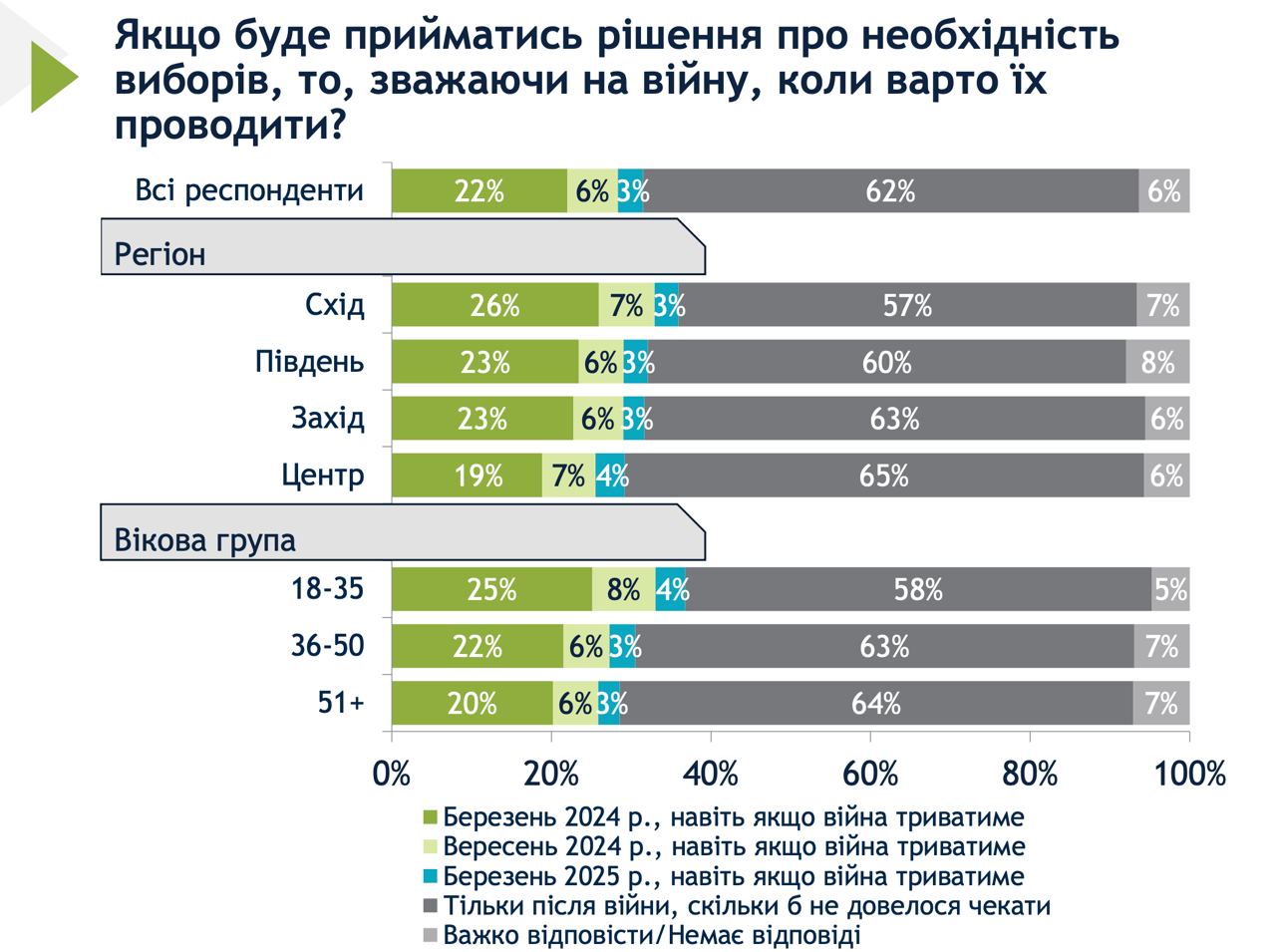 Але загалом в усіх регіонах та серед усіх вікових груп більшість респондентів проти проведення виборів до закінчення війни.