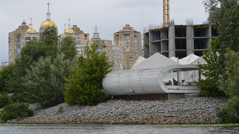 Житловий комплекс «Ріверстоун» частково готовий, частково будується. Здається, навіть потенційні мешканці дорогих квартир будинку не зможуть нормально прогулятися над Дніпром. Про доступ усіх киян до річки в цьому місці взагалі не йдеться.