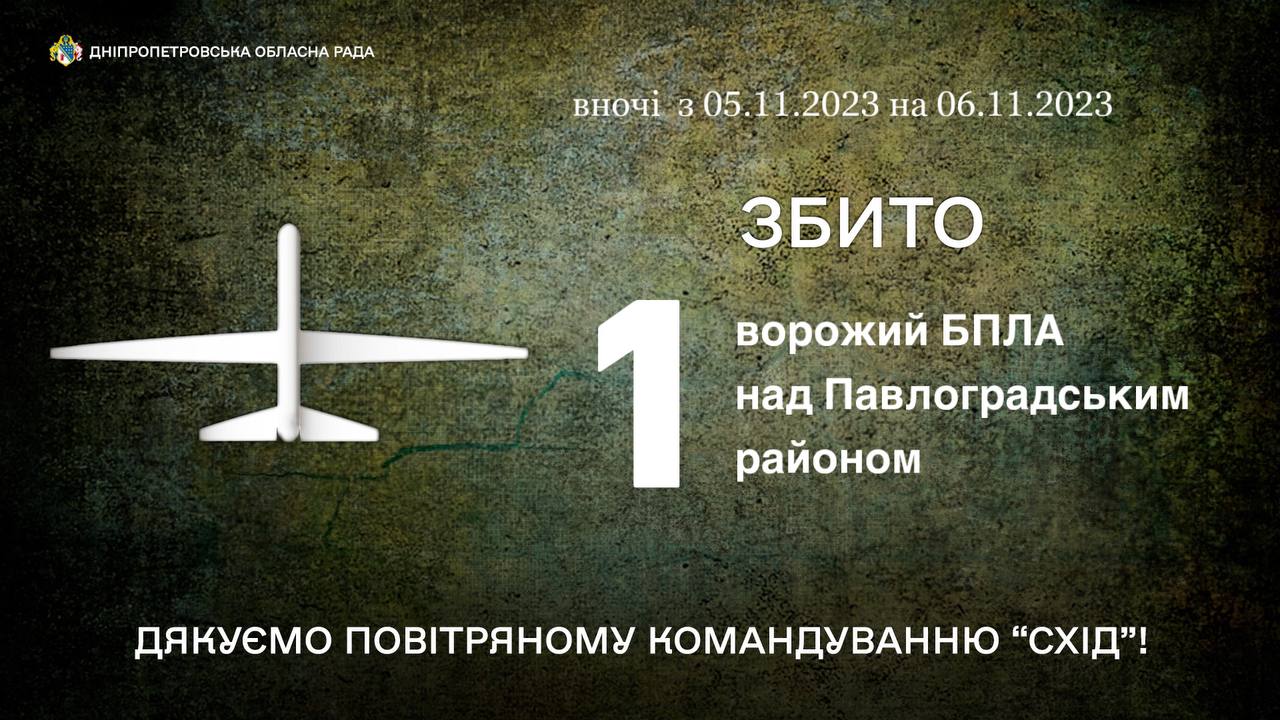 "Вночі ворожий безпілотник збили над Павлоградським районом. Дякую військовим з ПвК "Схід" за цілодобовий захист", – йдеться у повідомленні глави Дніпропетровської облради Миколи Лукашука.