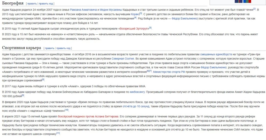 Далі автор у "Вікіпедії" розповів про розвиток спортивної кар’єри Кадирова-молодшого. Зокрема, він розповів, як син Кадирова здобув перемоги на боксерських, кікбоксерських та інших турнірах — його суперники падали та не вставали після легких ударів, або взагалі майже не атакували. Або ж судді "відправляли в нокдаун" сильніших суперників.
