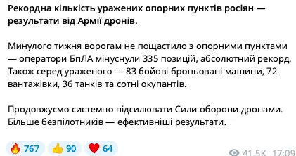 За тиждень із 30 жовтня по 6 листопада оператори "Армії дронов" вразили рекордну, з початку повномасштабного вторгнення, кількість опорних пунктів окупаційної армії Росії. У ворога стало на 335 позицій менше.