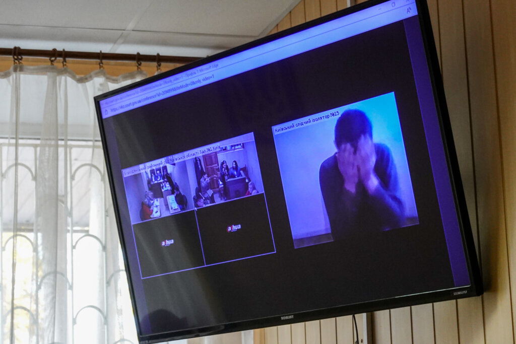 Десантник Радік Гукасян ховається від фотокамер, тому на екрані видно тільки короткострижену маківку або обличчя, прикрите руками. У засіданні Бородянського райсуду Київщини росіянин, обвинувачений у воєнних злочинах, бере участь онлайн-звʼязком із СІЗО Києва.