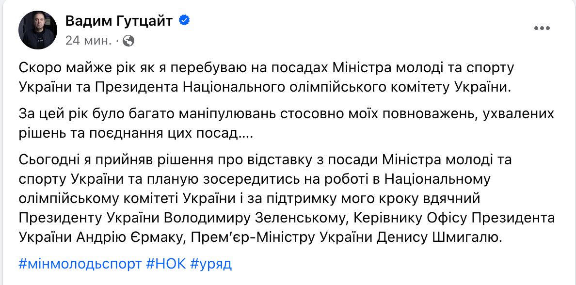 "За цей рік було багато маніпулювань щодо моїх повноважень, прийнятих рішень та поєднання цих посад. Сьогодні я ухвалив рішення про відставку з посади міністра молоді та спорту України та планую зосередитися на роботі у Національному олімпійському комітеті України", - повідомив Гутцайт.