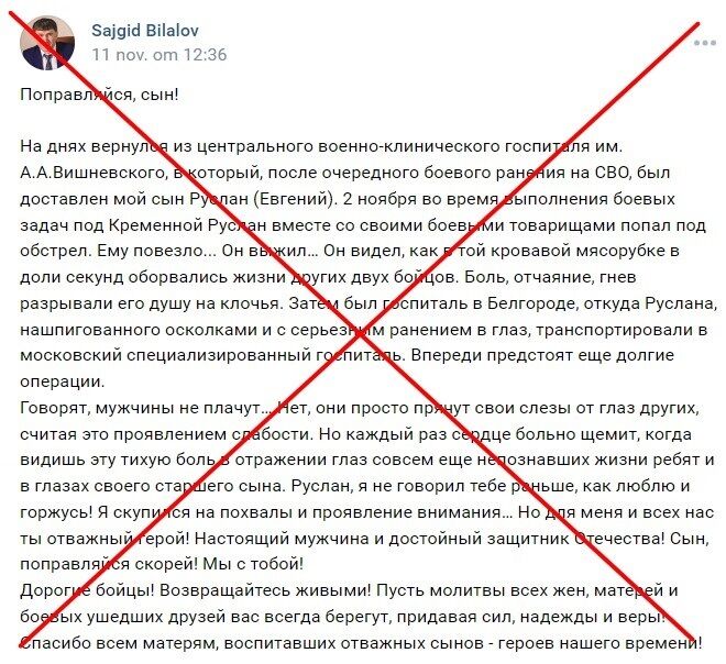 Радник губернатора Свердловської області РФ Сайгід Білалов сам похвалився у соцмережах, що син Руслан, якого в дужках він вказав ще і Євгеном, вдруге отримав поранення в Україні.