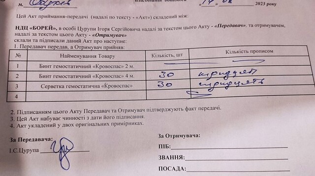 Приклад фіктивного акту прийому-передачі нелегального «Кровоспасу» Ігорем Цурупою. Фото: Facebook.