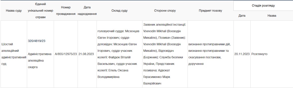 У Київському окружному адміністративному суді, куди відпочатку надійшов позов адвокатів Воєводіна, шальки терезів схилилися в бік вітчизняних можновладців. 3 серпня 2023 року суддя Альона Кушнова відмовила у задоволенні зазіхань одного з ватажків так званого "Лужниковського ОЗУ" зокрема, "з підстав того, що суд вважає повноваження СБУ щодо оцінки загрози діями позивача національній безпеці України дискреційними та виключними, а також такими, які не повинні переоцінюватися судовими органами".