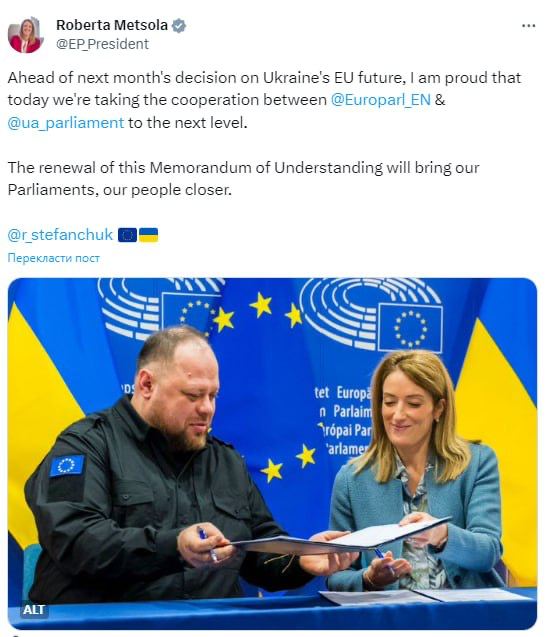 Про таке повідомила президентка Європарламенту Роберта Метсола під час спільної пресконференції з головою ВРУ Русланом Стефанчуком у Брюсселі.