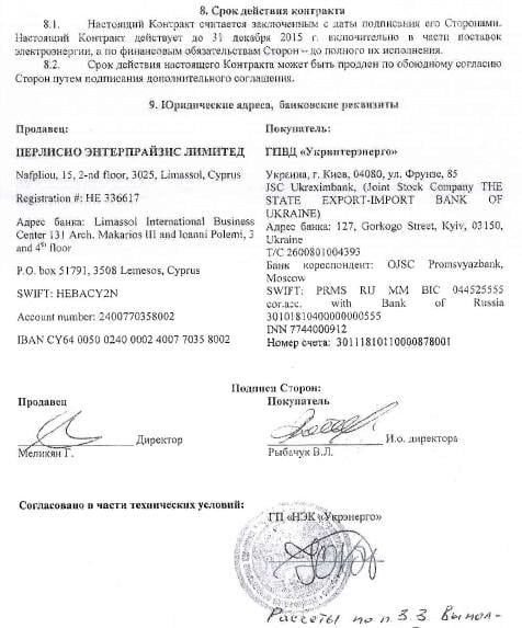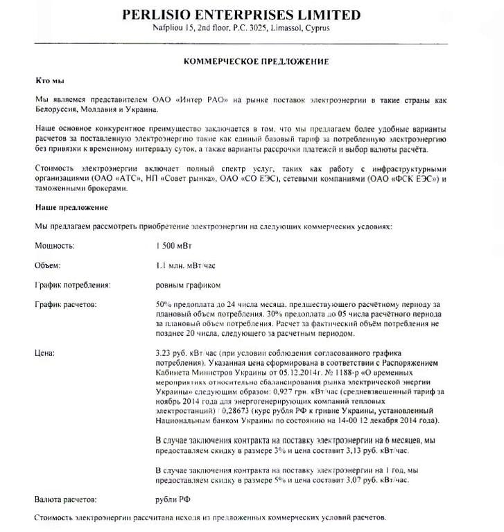 “19 декабря 2014 года был подписан контракт на импорт электроэнергии через кипрскую прокладку “Перлисио”. Там можно увидеть подпись Юрия Касича, бывшего и.о. директора НЭК “Укрэнерго”, который был назначен “по рекомендации” Григоришина. “Перлисио” находится по одному адресу с другими оффшорками Григоришина. И наконец он сам подтвердил, что был участником переговоров по импорту. В итоге “Перлисио” должна была поставлять в Украину 11,088 млрд кВт-ч э / э. Цена покупки в России около 0,68 грн, цена продажи в Украине у 0,86 грн. То есть на российских счетах кипрской прокладки “Перлисио” хотели осадить маржу почти в 2 млрд грн. Копии соответствующих уже подписанных документов вы можете увидеть. По сути, была создана “Росукрэнерго” на рынке электроэнергии. Наверное, так господин Григоришин видит построение сильной экономики Украины”, – заявил он.