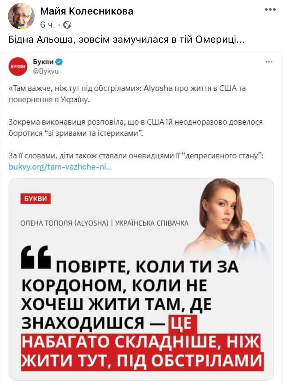 Дружина лідера гурту "Антитела" Тараса Тополі, співачка Alyosha, яка нещодавно повернулася зі США, заявила, що життя за кордоном важче, ніж в Україні під обстрілами.