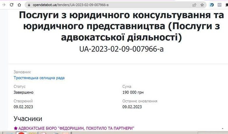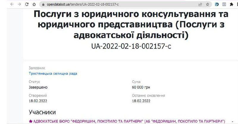 Адвокатське бюро «Федоришин, Покотило і партнери» брало участь всього в п’яти публічних торгах, про що свідчать відкриті дані публічних закупівель. Одна угода з івано-франківським замовником принесла юристам бюро скромні 8 тисяч гривень. А далі найцікавіше: Тростянецька селищна рада уклала з адвокатським бюро племінника Червонецької угоду про послуги, які оплачувалися з бюджету Тростянецької громади і приносили непогані прибутки фірмі київського племінника. Протягом останніх років адвокатське бюро «Федоришин, Покотило і партнери», отримало з бюджету Тростянецької громади 430 тис. грн.