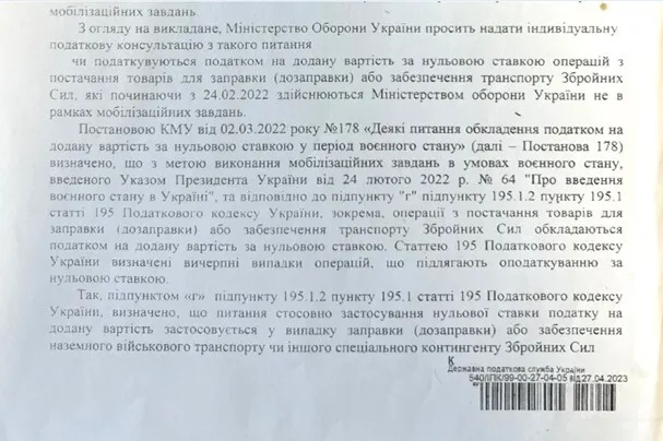 До того ж, посилаючись, на нібито, надану індивідуальну консультацію Державною податковою службою України (лист від 27.04.2023 №540/ПК/99-00-27-04-05), у відомстві заявляють про правомірність даної закупівлі. Оскільки дане пальне закуплялося не для виконання мобілізаційних завдань, як це зазначено в Постанові 178.