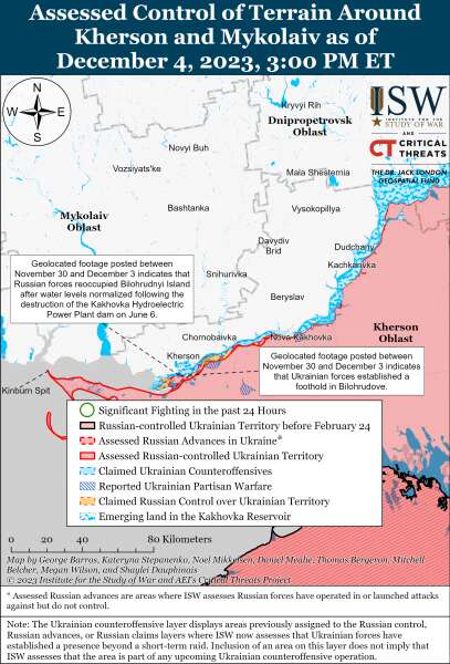4 грудня українські війська продовжили наземні операції на східному (лівому) березі Херсонської області і нещодавно зайняли підтверджену позицію на острові Білогрудний на південний захід від Херсона.