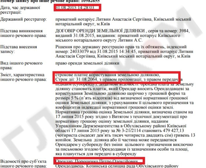 Проблему с доступом к воде президент решил совсем недавно. Согласно реестру прав на недвижимое имущество, Порошенко заключил договор аренды береговой линии площадью 0,75 гектара на 49 лет (до 2064 года) 31 августа 2015 года.