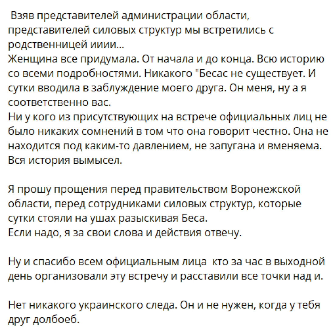 У повідомленні йдеться про те, що в пілота нібито випустили з вогнепальної зброї сім куль, а обставини і причини досі точно невідомі. При цьому місцева влада стверджує, що не було ніякого льотчика, а він взагалі звільнився два тижні тому. Він відкинув версію щодо причетності українських спецслужб до ліквідації окупанта.