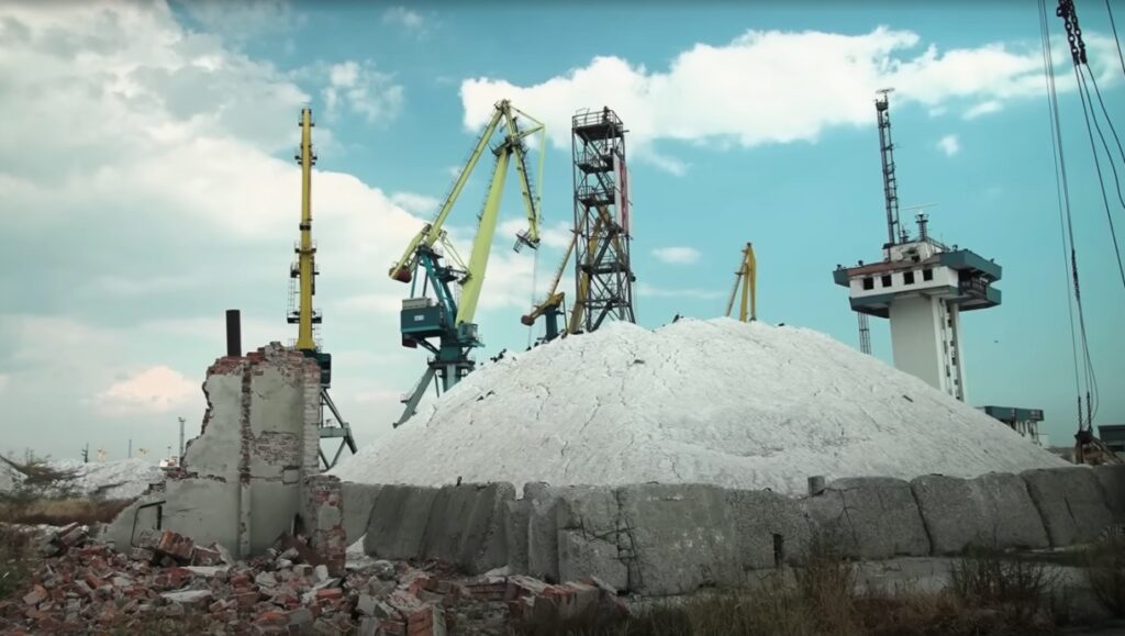 Майданчик для зберігання каоліну в порту Маріуполь, вересень 2023 р. Фото: скріншот з відео російських пропагандистів