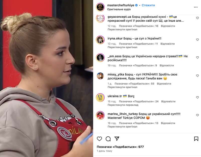 На помилку відреагувала, зокрема, українська діаспора в Туреччині. Під відповідним дописом кулінарного проєкту в Instagram зібралося понад 250 коментарів, у яких українці пояснюють авторам шоу, що борщ – це не просто українська страва, а "нематеріальна культурна спадщина ЮНЕСКО".